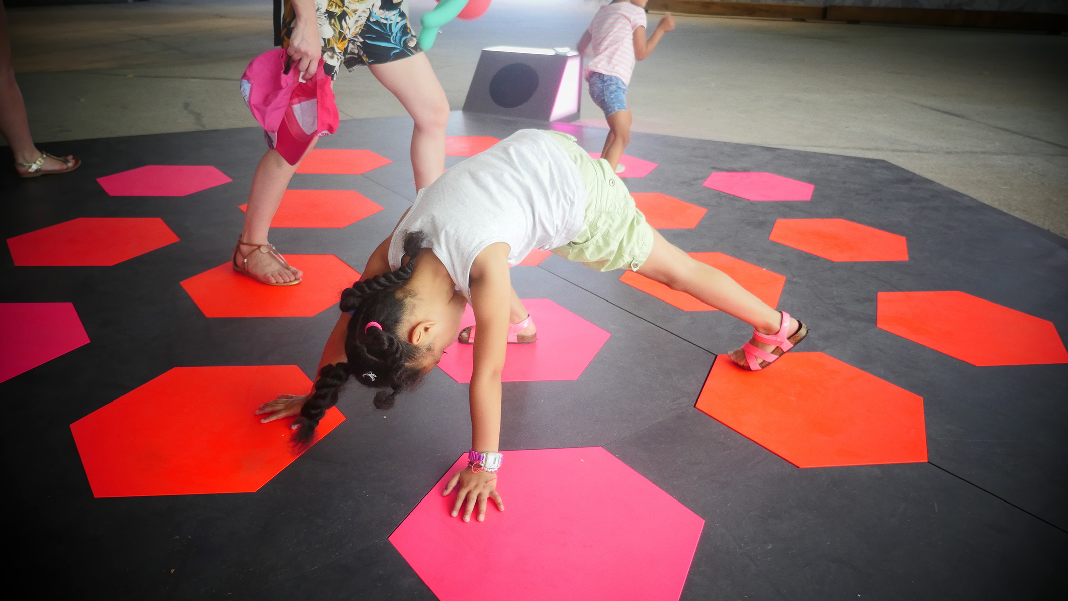 Danse Harmonie prend la forme d’une piste de danse interactive de 6 x 6 m2, dont chaque dalle génère un son par un capteur capacitif.