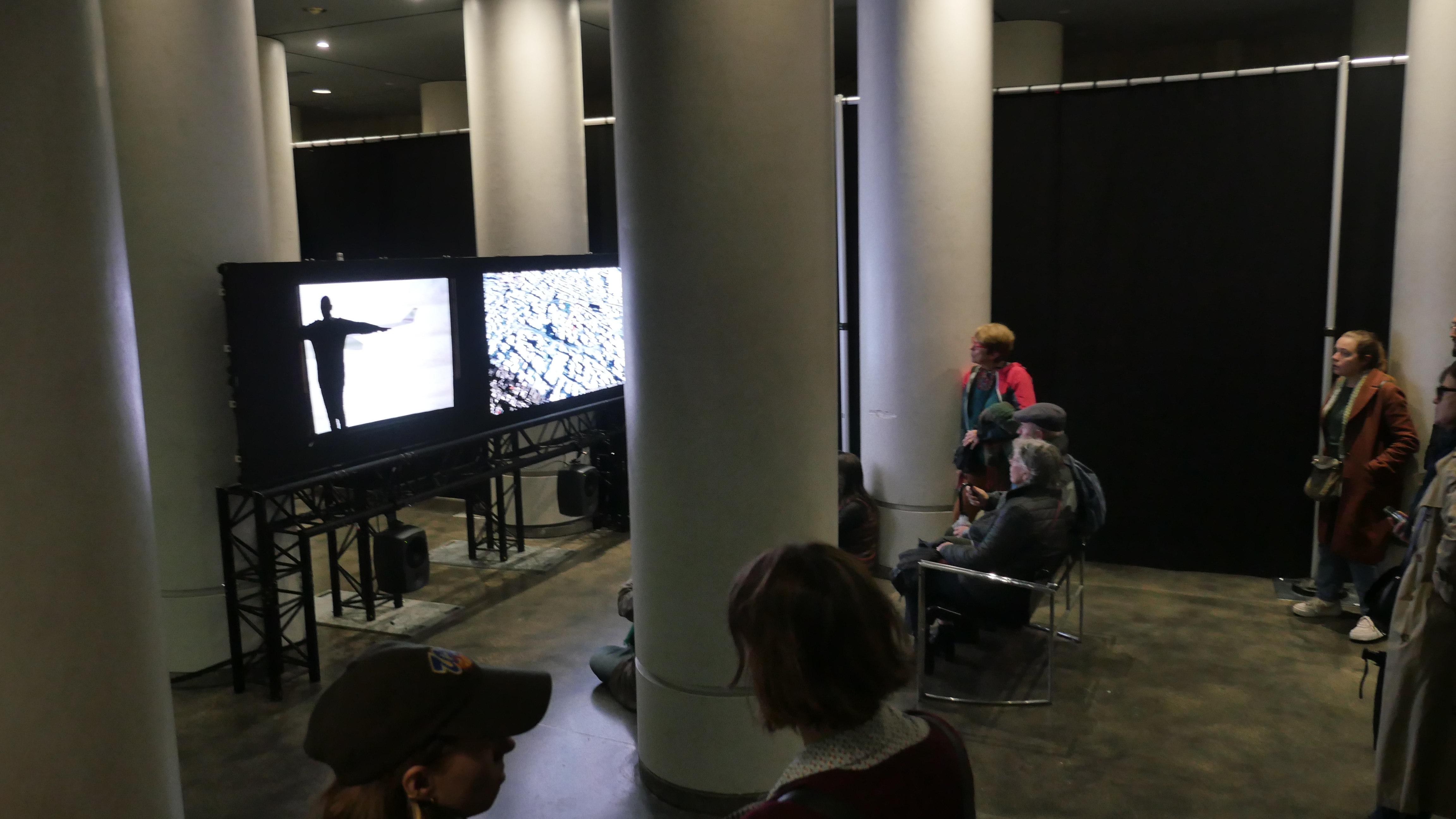 quatre enceintes diffusant des sons distincts, est donc spatialisé, et permet au public d’apprécier un parcours audio unique au gré des déplacements. Les voix et témoignages s’entrecroisent et se mélangent, matérialisant une narration à voix multiples, à l’instar d’une mémoire collective.